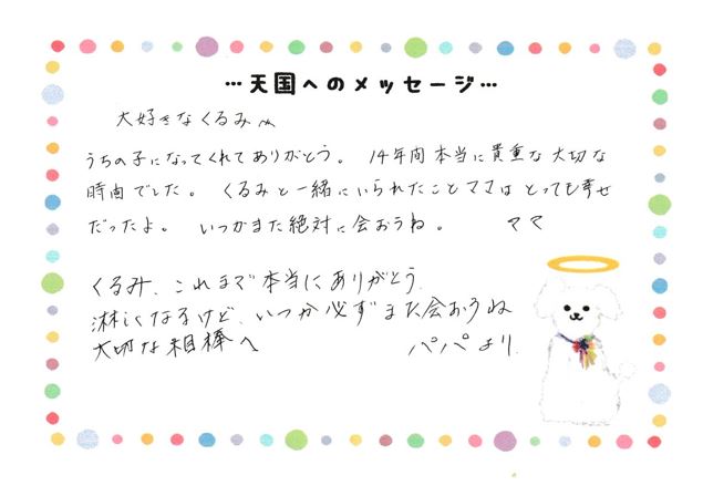 大崎市 くるみちゃん 命日:令和7年10月26日 大好きなくるみへうちの子になってくれてありがとう。14年間本当に貴重な大切な時間でした。くるみと一緒にいられたことママはとっても幸せだったよ。いつかまた絶対に会おうね。ママくるみ、これまで本当にありがとう淋しくなるけど、いつか必ずまた会おうね大切な相棒へパパより