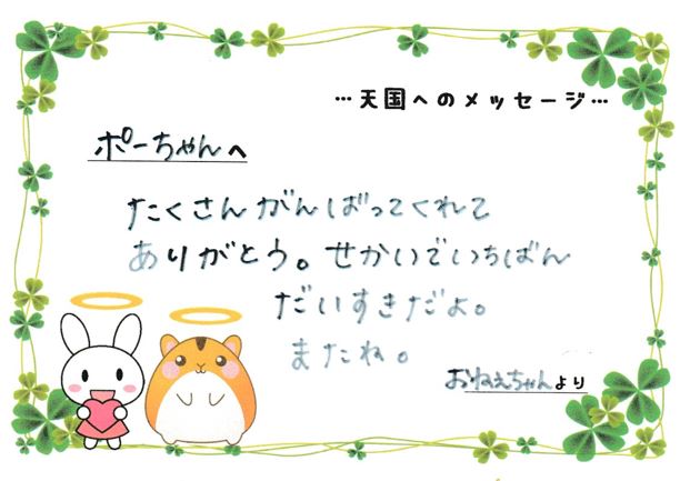 ぽーちゃんたくさんがんばってくれてありがとう。せかいでいちぱんだいすきだよ。またね。おねえちゃんより
