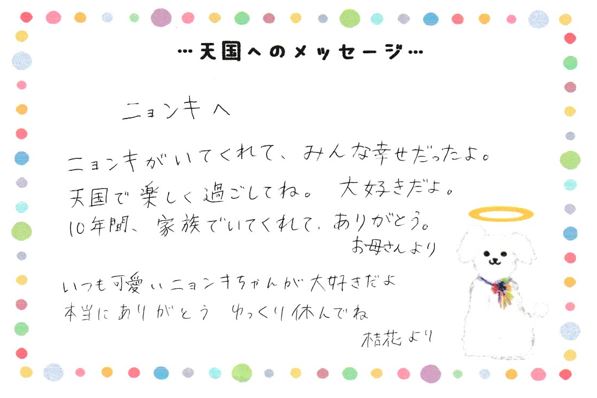 東松島市 ニョンキくん 命日:令和7年12月1日 ニョンキへニョンキがいてくれて、みんな幸せだったよ。天国で楽しく過ごしてね。 大好きだよ。10年間、家族でいてくれて、ありがとう。お母さんよりいつも可愛いニョンキちゃんが大好きだよ本当にありがとう ゆっくり休んでね 桔花より