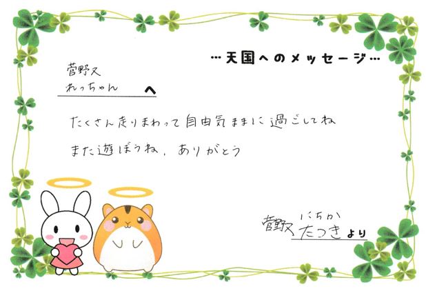 菅野又 れっちゃん へ たくさん走りまわって自由気ままに過ごしてねまた遊ぼうね、ありがとう菅野又 にちか たつき より