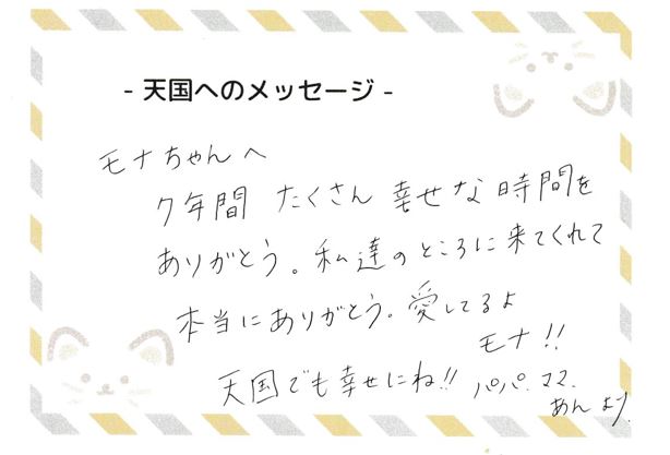 登米市 モナコくん 命日:令和7年12月5日 モナちゃん へ 7年間 たくさん幸せな時間をありがとう。私達のところに来てくれて本当にありがとう。愛してるよ モナ!!天国でも幸せにね!!パパ、ママ、 あん より