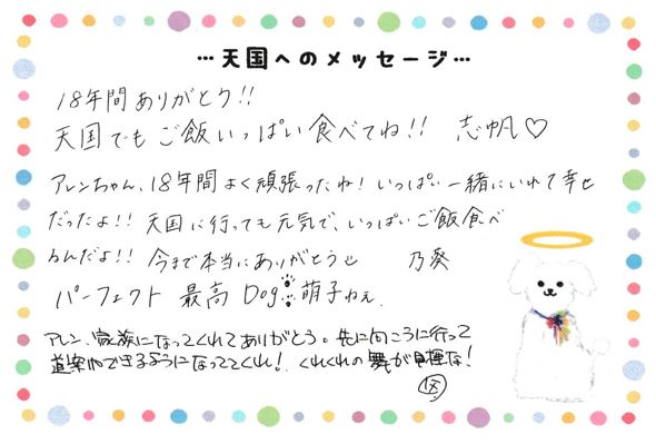 大崎市 アレンくん 命日:令和7年12月15日 18年間ありがとう!!天国でもご飯いっぱい食べてね!! 志帆♡アレンちゃん、18年間よく頑張ったね!いっぱい一緒にいれて幸せだったよ!!天国に行っても元気で、いっぱいご飯食べるんだよ!!今まで本当にありがとう😊パーフェクト 最高 Dog 萌子ねぇ。 乃葵アレン、家族になってくれてありがとう。先に向こうに行って道案内できるようになっててくれ!くれくれの舞が目標な! 父