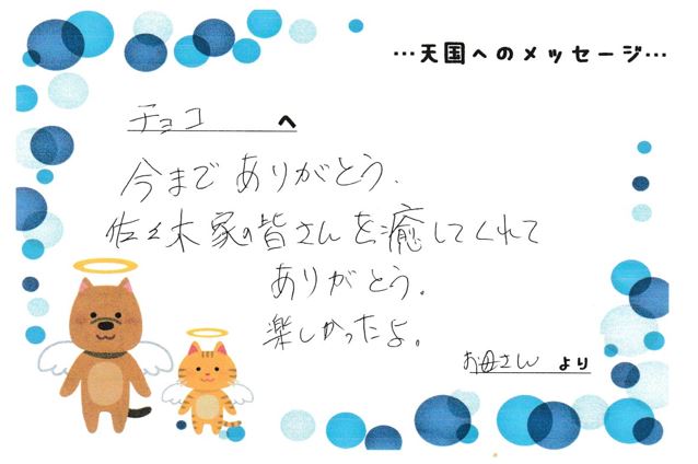 チョコ へ今までありがとう。佐々木家の皆さんを癒してくれてありがとう。楽しかったよ。お母さん より