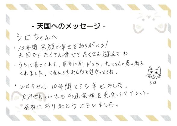大崎市 シロくん 命日:令和8年1月9日 シロちゃんへ・10年間 笑顔と幸せをありがとう! 天国でもたくさん食べてたくさん遊んでね・うちに来てくれて、本当にありがとう。たくさんの思い出をくれました。これからもみんなを見守っててね。・シロちゃん、10年間とても幸せでした。天国でもいつでも私達家族を見守ってて下さい。本当にありがとうございました。