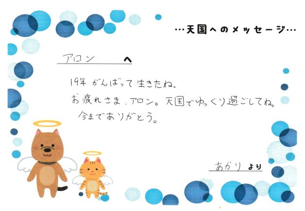 アロン へ19年 がんばって 生きたね。お疲れさま. アロン。天国でゆっくり過ごしてね。今までありがとう。あかり より