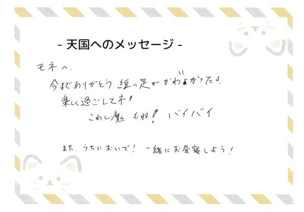モネへ今までありがとう 短い足がかわいかった♪楽しくすごしてネ❣こわし魔 もね ❕ バイバイまた、 うちにおいで! 一緒にお昼寝仕様!