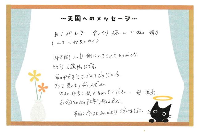 栗原市 ちぃくん 命日:令和8年1月23日 ありがとう。ゆっくり休んでね。(ユキと仲良くね!) 靖子14年間いつも側にいてくれてありがとう。とても心強かったです。家の中ですごしてばかりだったから、外を思いっきり楽しんでね。ゆきと、仲良く遊びまわって下さい。おばあちゃんとの散歩も楽しんでね。本当に今までありがとうございました。 母 暁美
