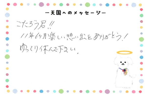 こたろう君!!11年6ヶ月楽しい想い出をありがとう!ゆっくり休んで下さい。