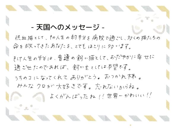 大崎市 クロくん 命日:令和8年3月3日 供血猫として、その人生の約半分を病院で過ごし、多くの猫たちの命を救ってきたあなたを、とてもほこりにいますタタいます。そして人生の半分は、普通の飼い猫として、おだやかに幸せに過ごせたのであれば、飼い主としては本望です。うちのコになってくれてありがとう。おつかれ様。みんなクロが大好きです。忘れないからね。よくがんばったね!! 世界一かわいい!!