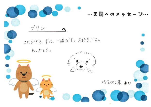 プリン へこれからも、ずっと、一緒だよ。大好きだよ。ありがとう🐶パパとママと蒼 より
