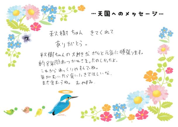美里町 秋樹ちゃん 命日:令和8年4月4日 秋樹ちゃん きてくれて ありがとう。 秋樹ちゃんの大好きなポムと元気に頑張ります。 約8年間おつかれさま。たのしかったよ。 これからゆっくりやすんでね。 気かがむいいたら会いにきてほしいな。 また会おうね。おやすみ。