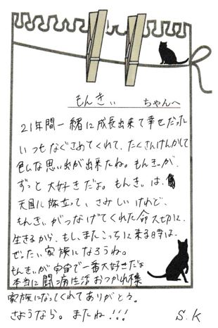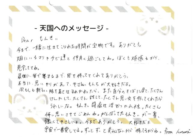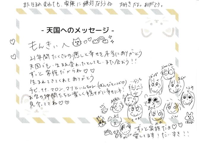 今まで、一緒に生きてこられた時間が宝物です。ありがとう。天国にいるマリやチビ達と仲良く過ごしてね。ぼくも頑張るから、