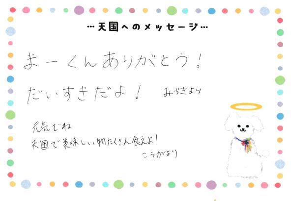 まーくんありがとう!だいすきだよ! みづきより元気でね天国で美味しい物たくさん食えよ!こうがより